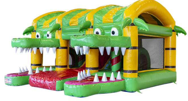 Op dit mooie Multiplay springkussen met krokodil thema kunnen kinderen lekker springen, klimmen en glijden. Binnenin het springkussen zijn diverse 3D-objecten geplaatst, waar kinderen overheen en onderdoor kunnen kruipen. Het springkussen is overdekt, dus zelfs tijdens een regenachtige dag te gebruiken. Ouders kunnen toezicht houden door de handig geplaatste netten. Prijs € 135,00 (iedere dag extra € 40,00) Lengte 5,9 m • Breedte 5,8 m • Hoogte 3,5 |