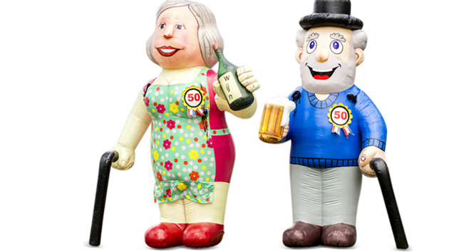 Het bereiken van de 50-jarige leeftijd is natuurlijk reden voor een feestje. Deze twee vrolijke opblaasbare poppen maken het feest compleet. Ze passen ook goed in een wat kleinere tuin. De poppen zijn voorzien van een button met hierop de leeftijd van de jarige. De buttons zijn verkrijgbaar in 50 en 65 jaar. Prijs € 40,00 per 3 dagen (iedere dag extra € 10,00) Hoogte 4 m •10 kg • Stroom 380W |